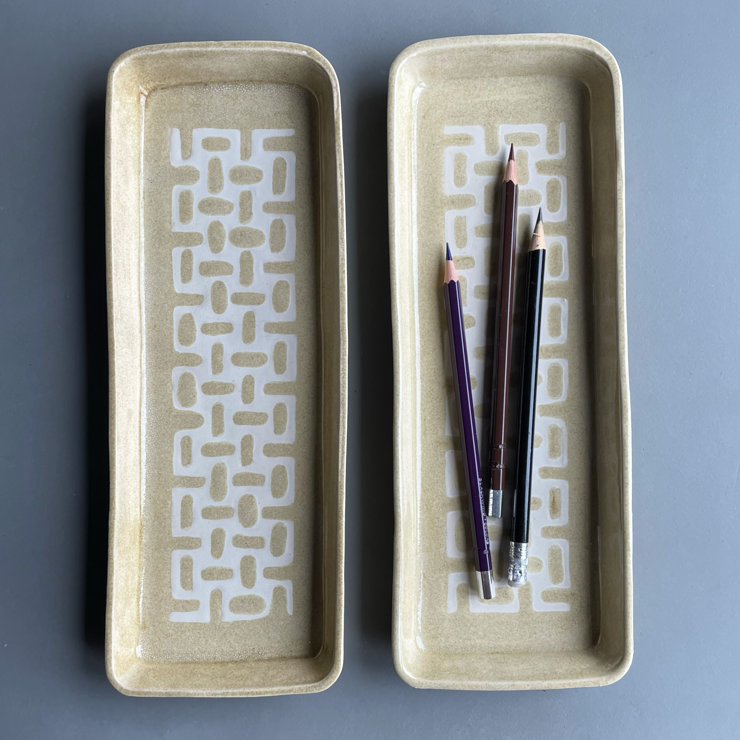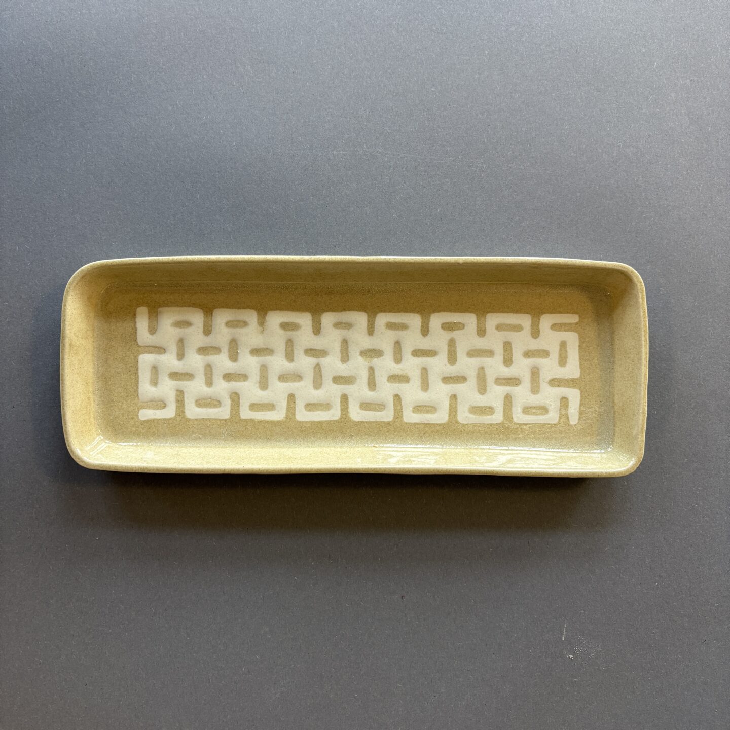 long dish with a white and iron glaze pattern. use it for snacks, sushi, or for your soaps. or your pens.