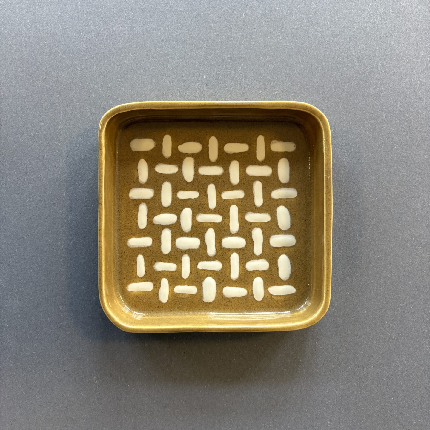 square dish with a white and iron glaze pattern. use it for snacks, sushi, or for your soaps.