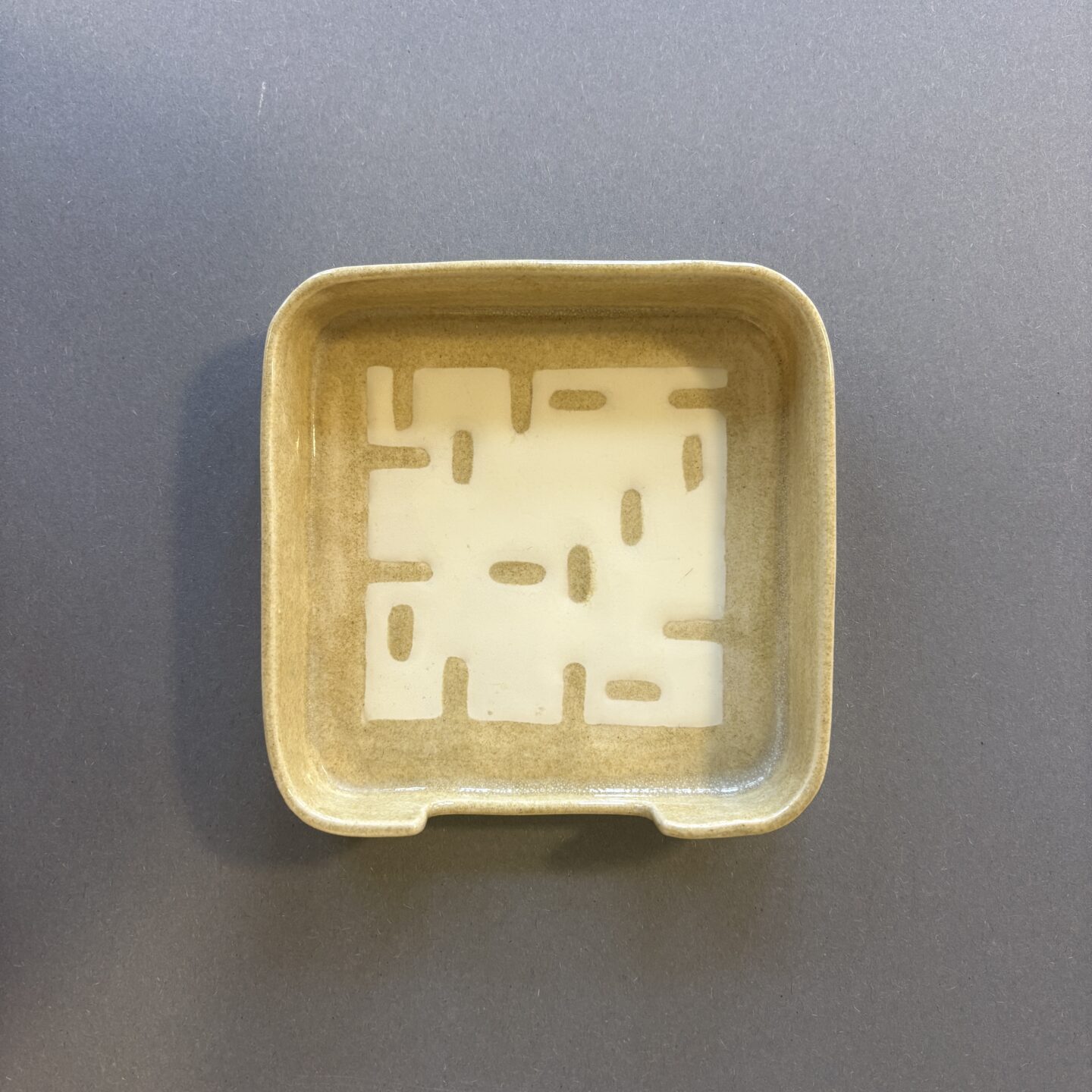 square dish with a white and iron glaze pattern. you could use it for your spoon when cooking.