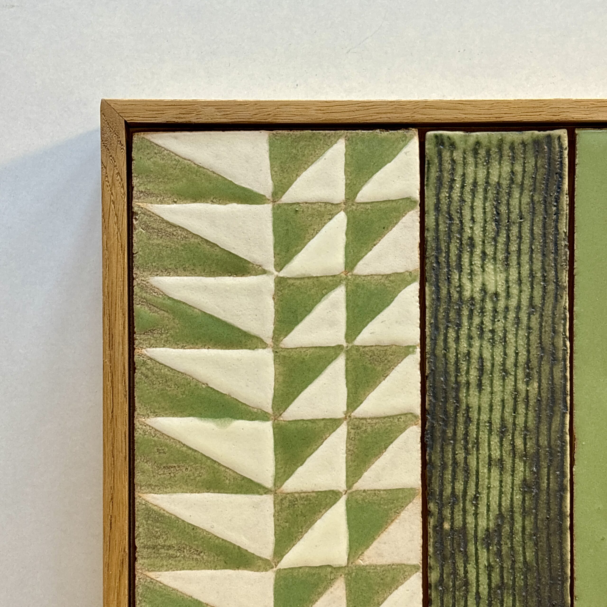 handmade tiles, green and greenish glazes. bespoke frame in oak.