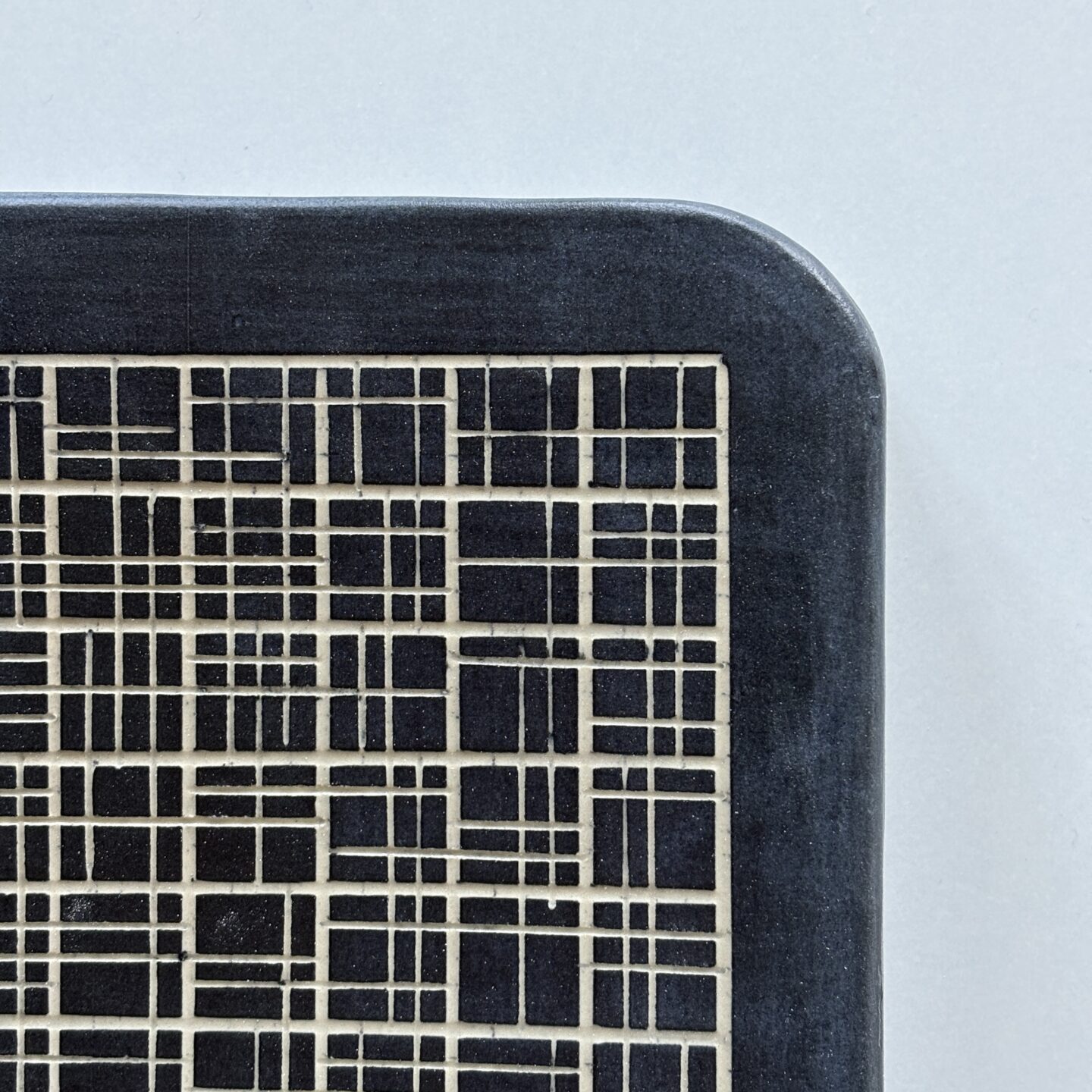 slip casted clay, black slip, sgraffito, matte glaze.