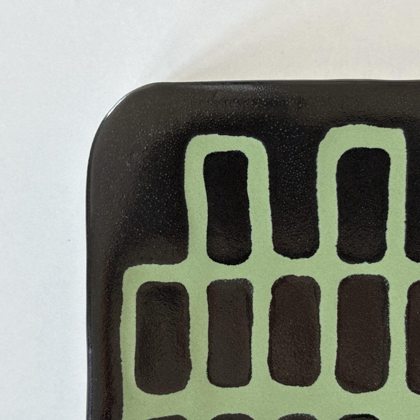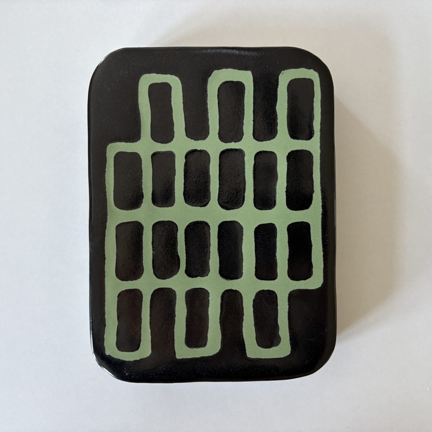 slip casted clay, black and green glazes.