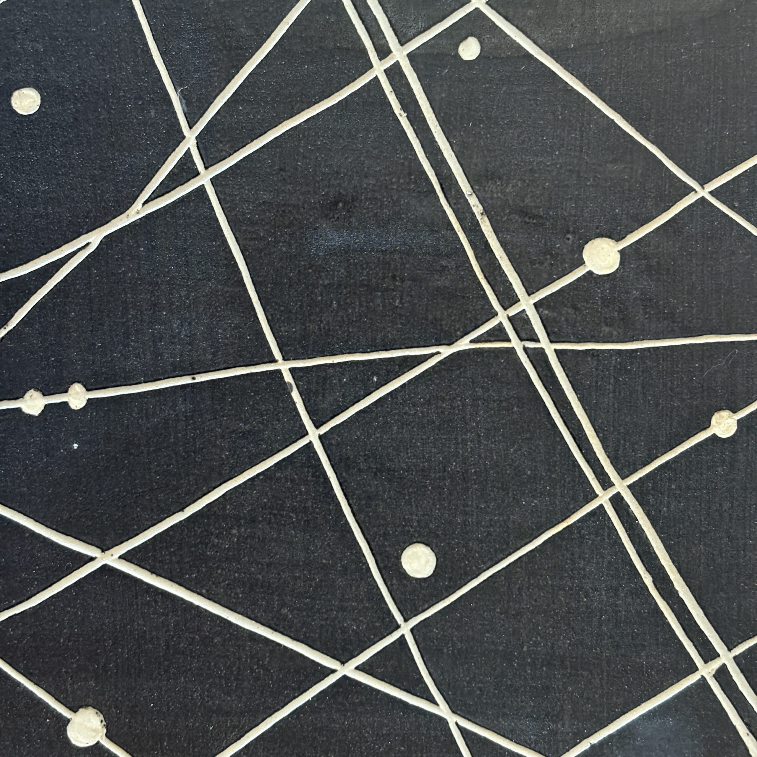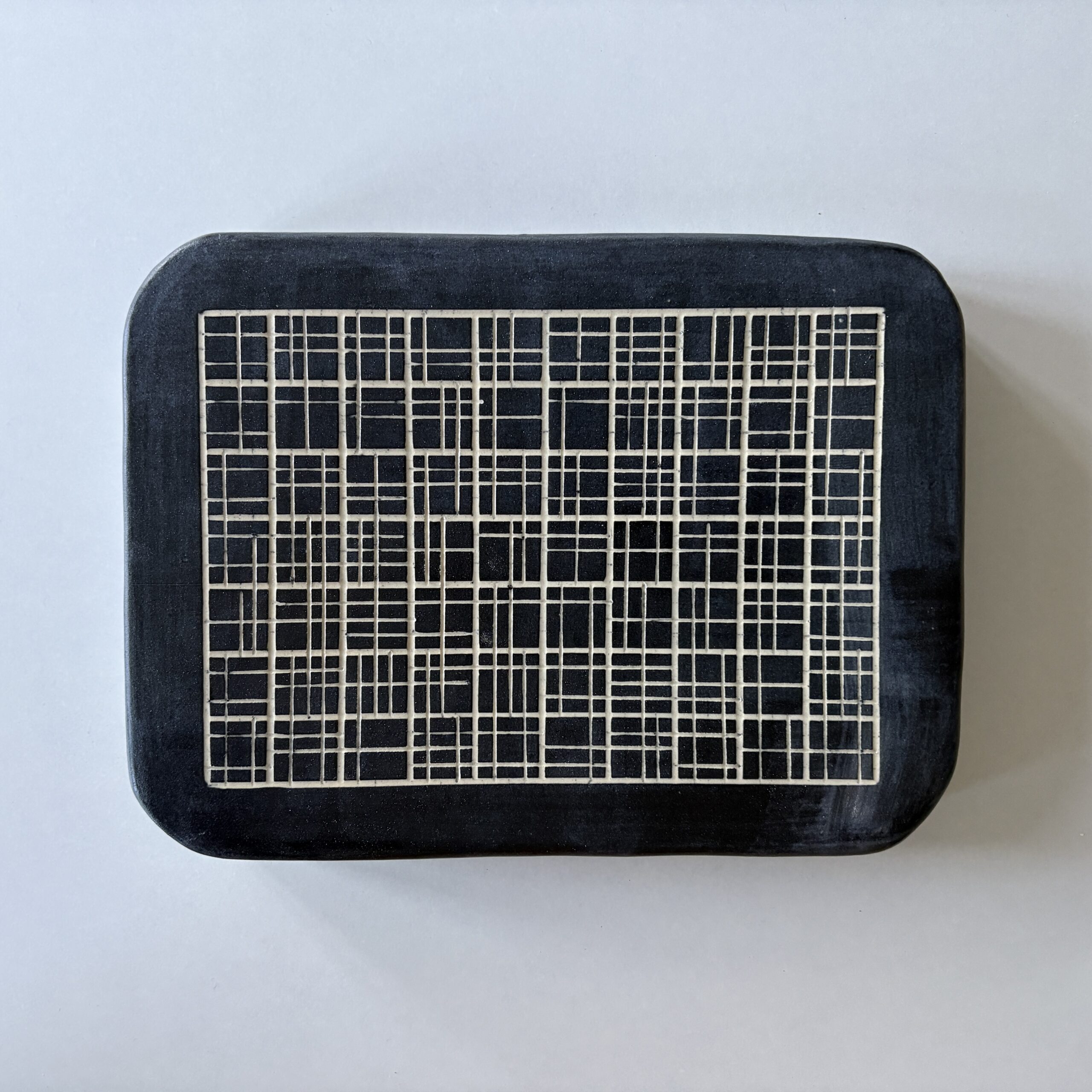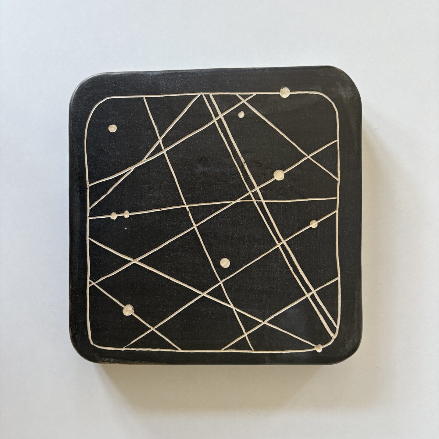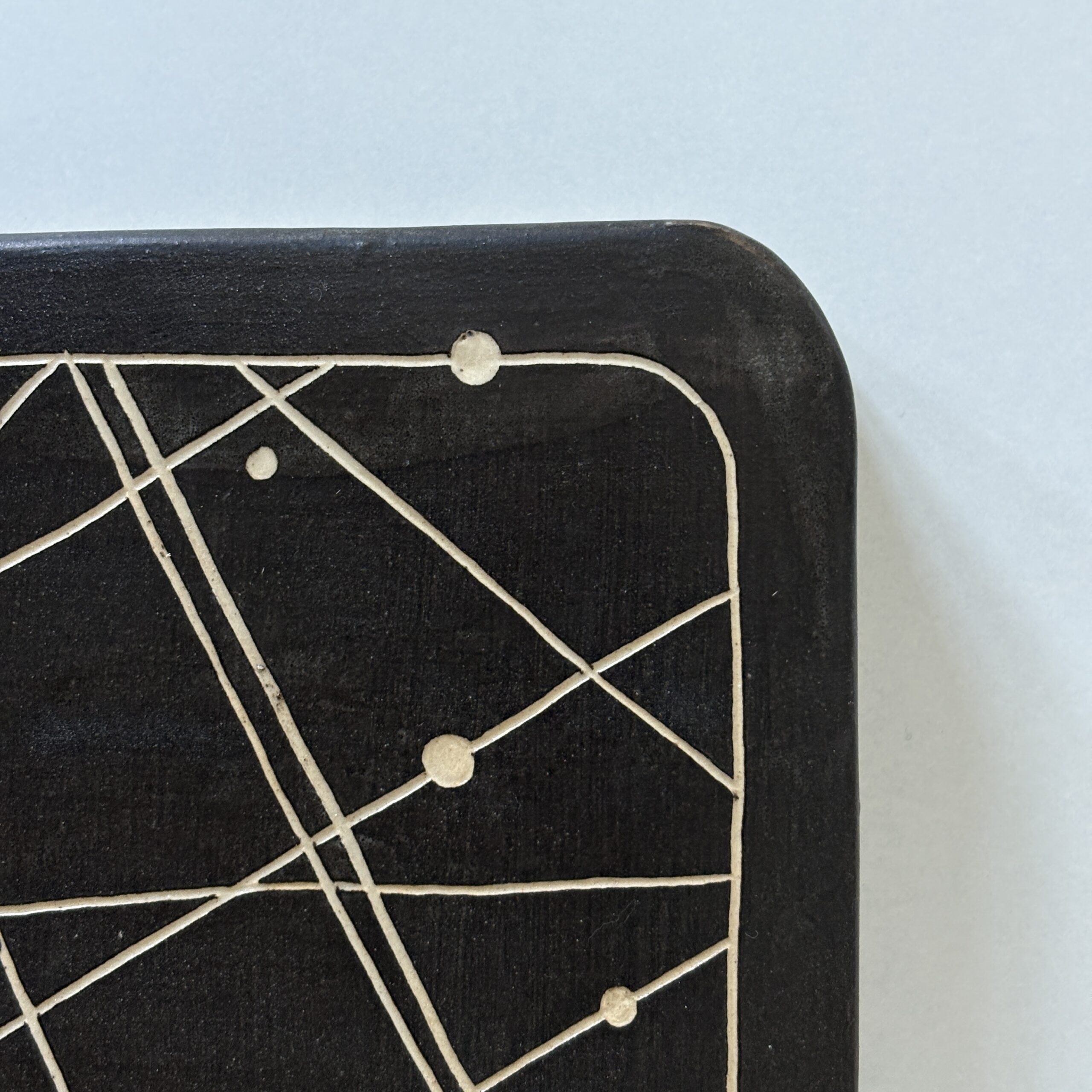 slip casted clay. black slip, sgraffito, matte transparent glaze.