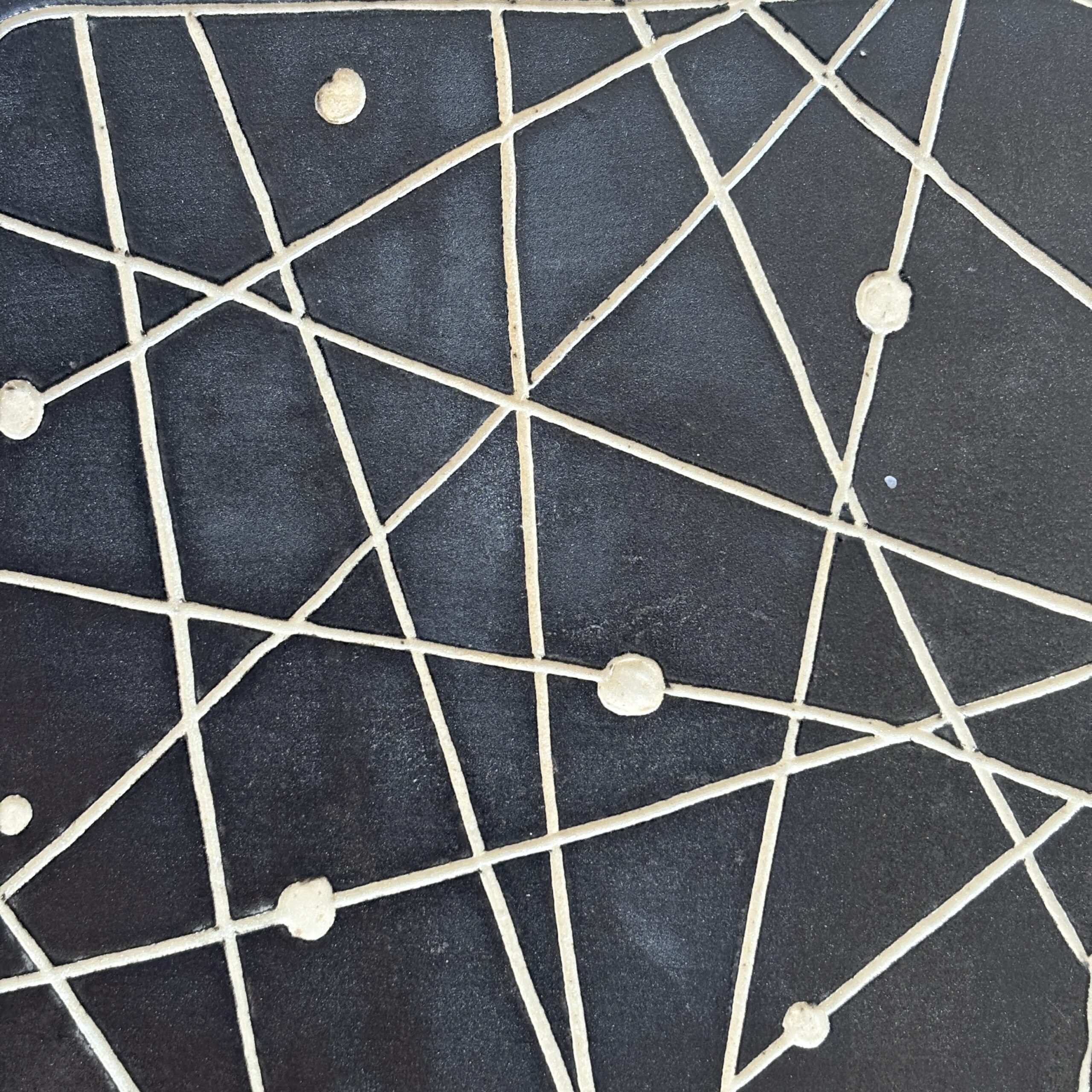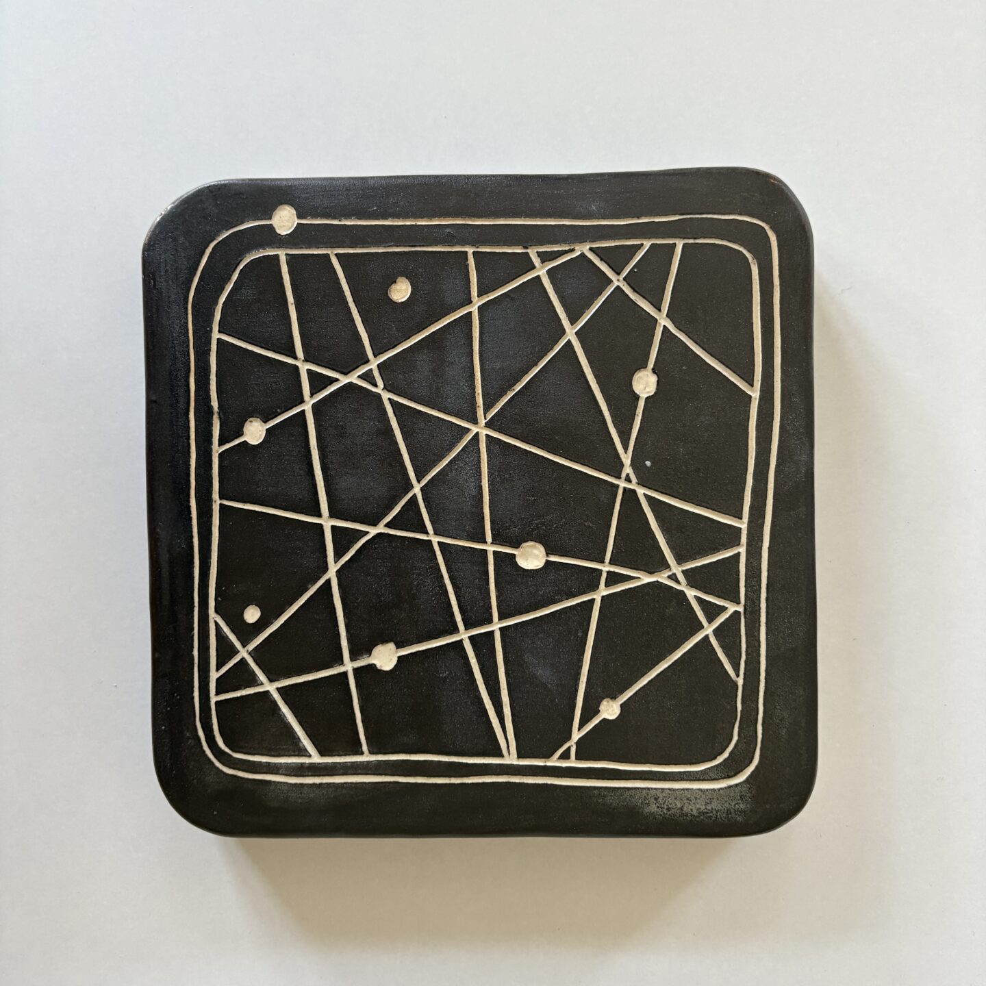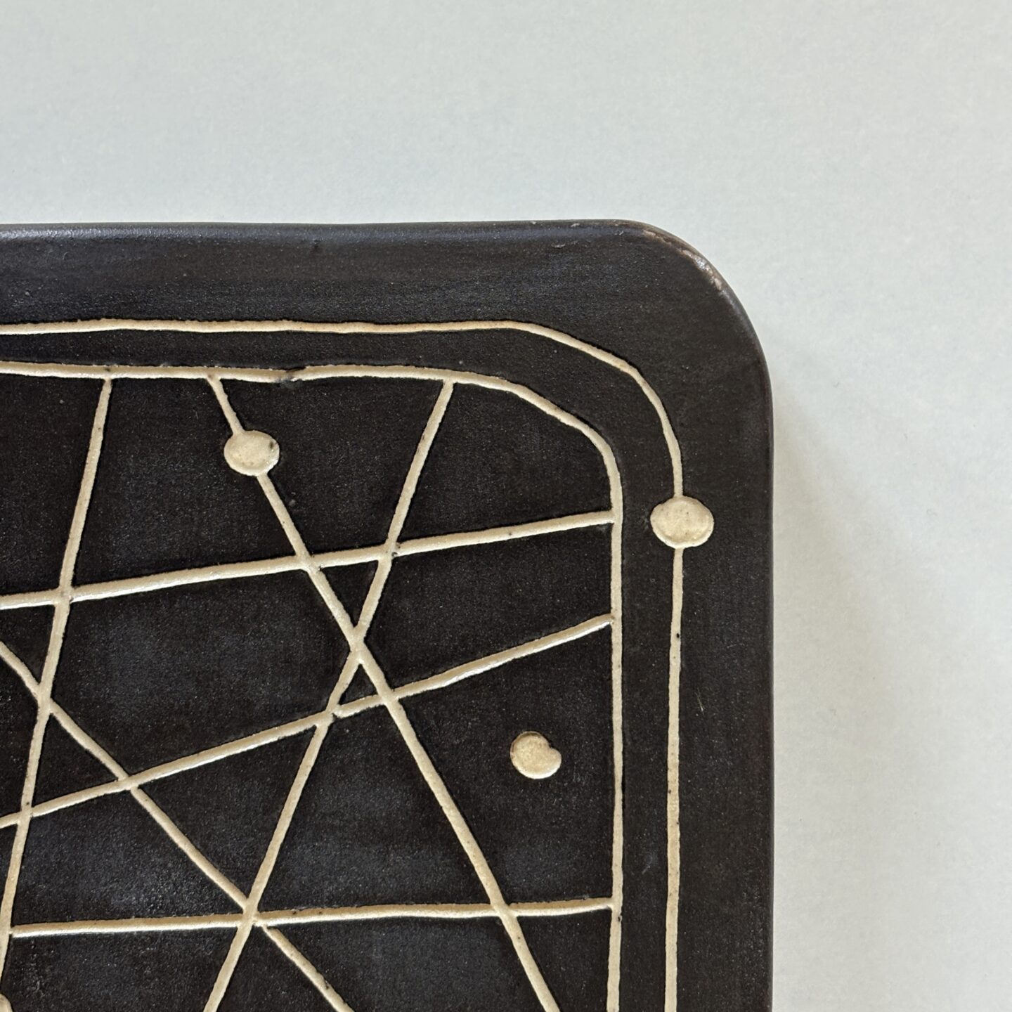slip casted clay. black slip, sgraffito, matte transparent glaze.